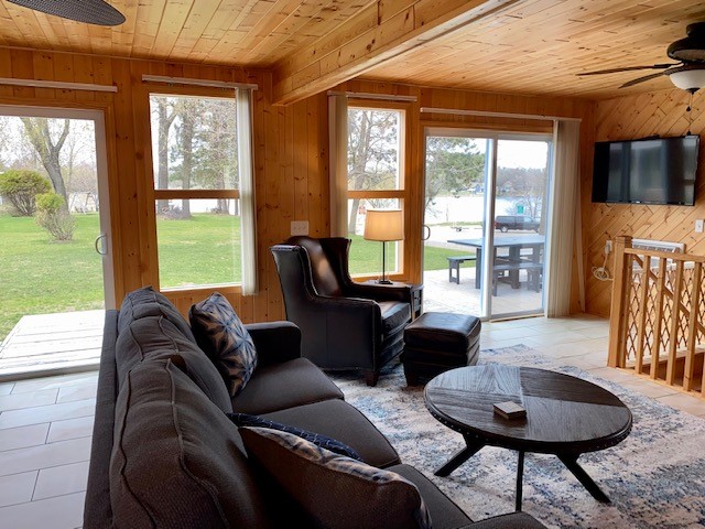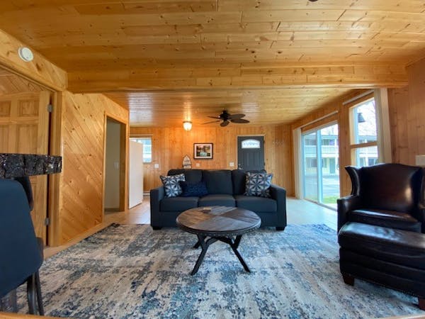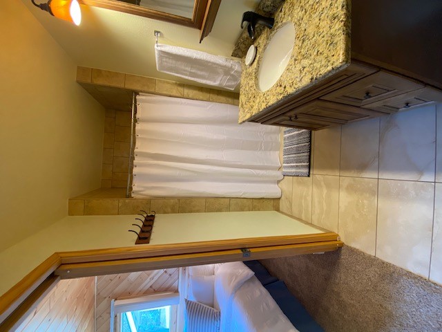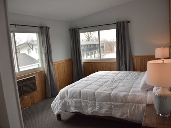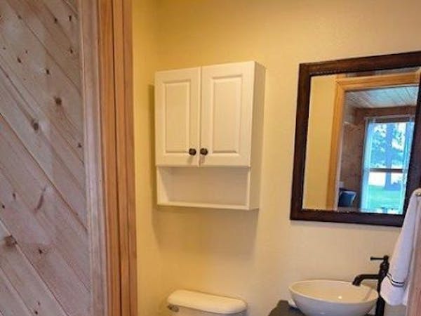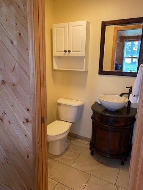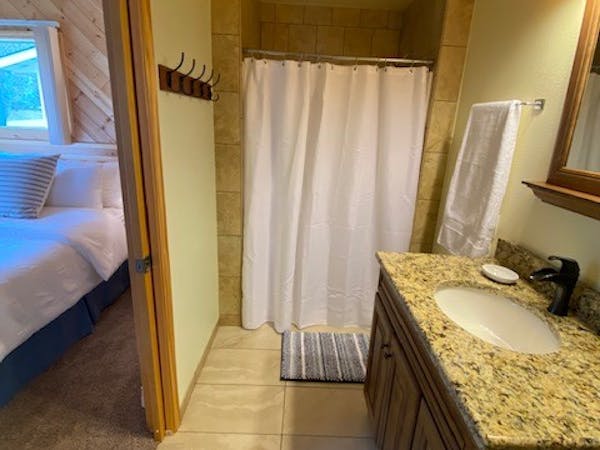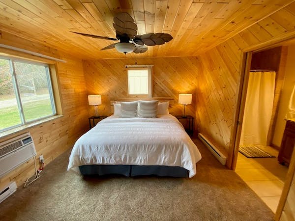 This quaint cabin can accommodate up to four guests. The cabin features a master bedroom with king bed and ensuite bathroom, a living room with a queen sleeper sofa, a galley kitchen and a half bathroom. Enjoy your meal on the cabin's private deck or simply put your feet up and enjoy the lakeview. The cabin includes free high-speed internet and is non-smoking.